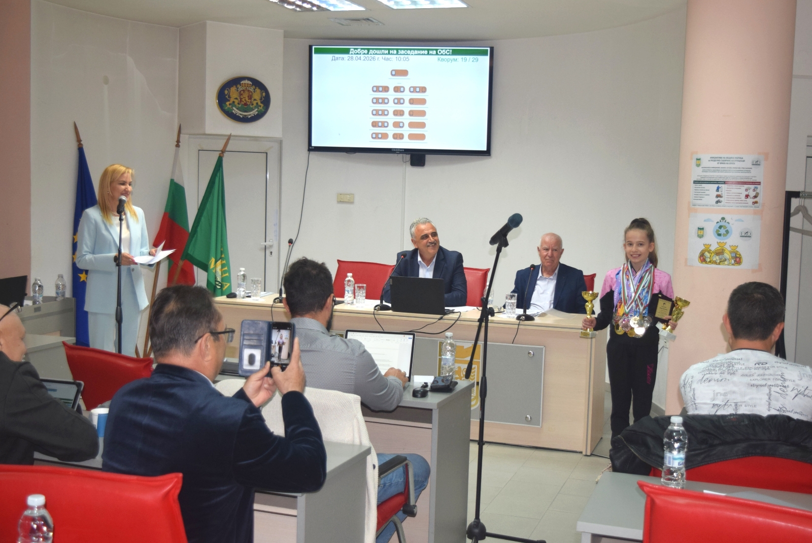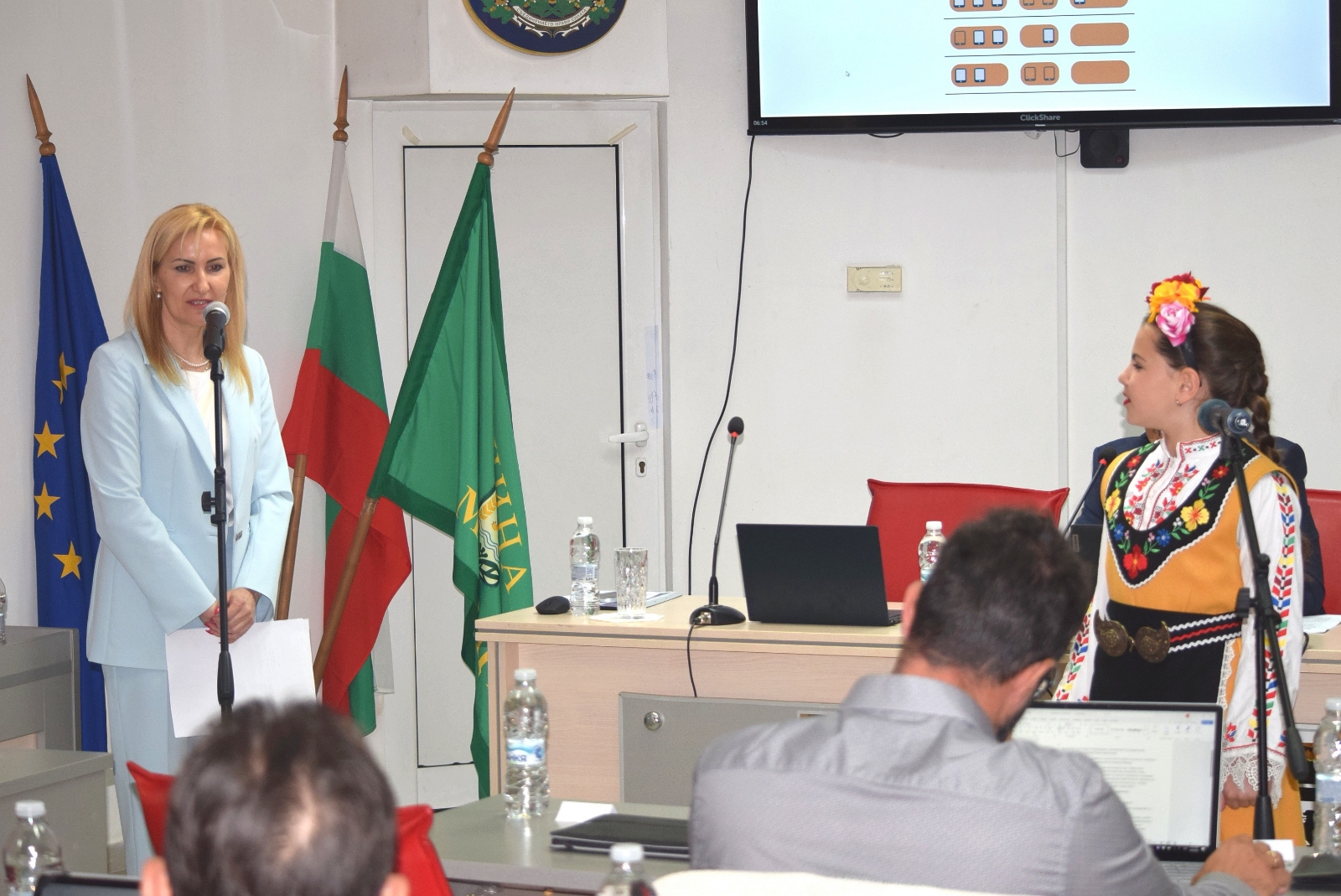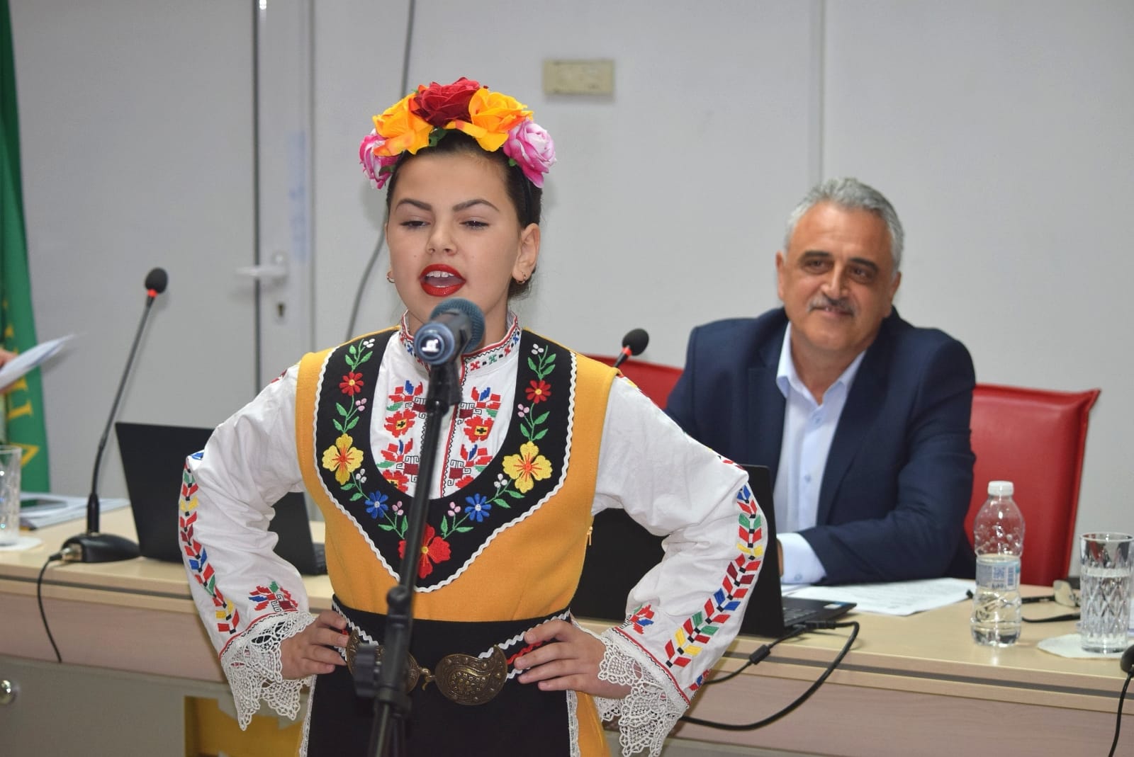 В навечерието на Гергьовден празничната атмосфера на сесията бе допълнена от музикален поздрав на Виолета Борикова, която изпълни песен пред общинските съветници и представители на администрацията и създаде тържествено настроение.